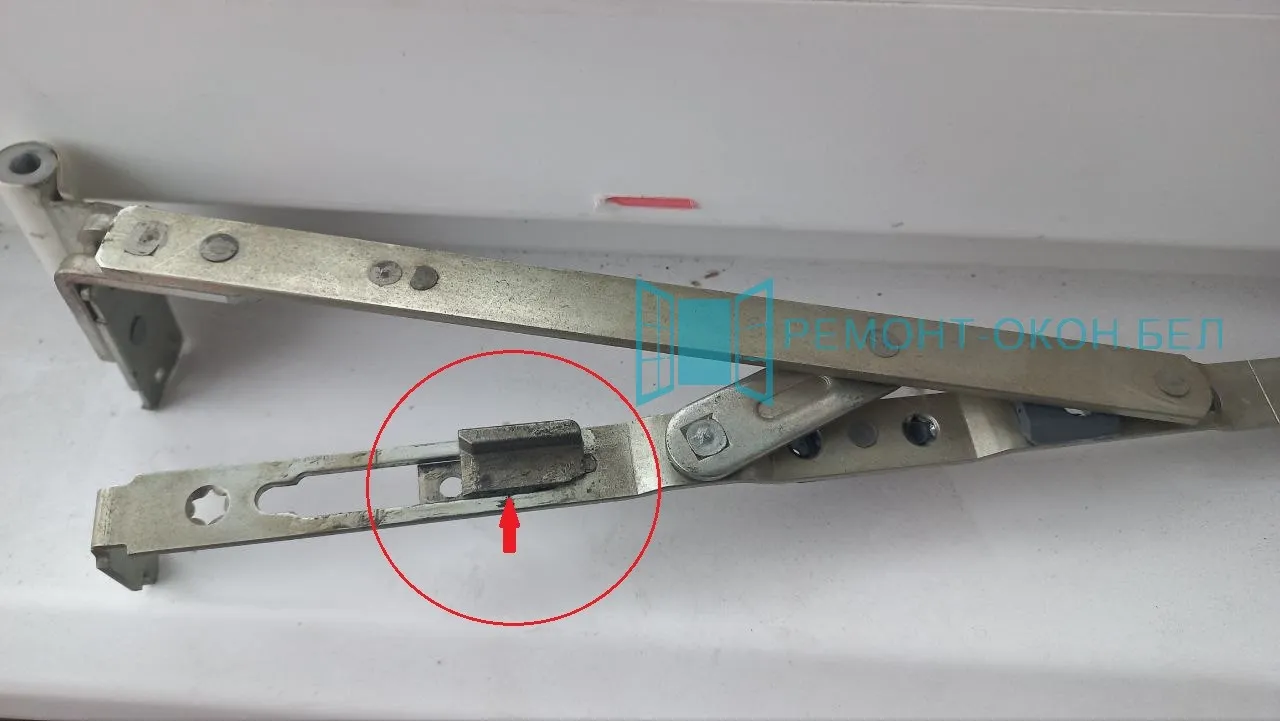 На фото ниже видна поломка элемента бокового запора оконной фурнитуры. Рядом находится новая деталь для замены. Лопается тонкая пластина на изгибе запорнрго элемента. Происходит это от пересыхания оконной фурнитуры. Старая смазка затвердела с годами. Частые поломки в фурнитуре: Maco, Artec. Если своевременно обслуживать фурнитуру, такие поломки исключены.
